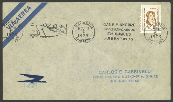 with slogan cancel "Win and save currency - Use Argentine ships" and illustration of ship, for 30/NO/1973 (Image)