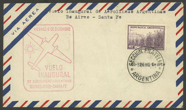 FLIGHT: Cover with handstamp of first flight Buenos Aires - Santa Fe by Aerolíneas Argentinas on 9/DE/1955 (Image)