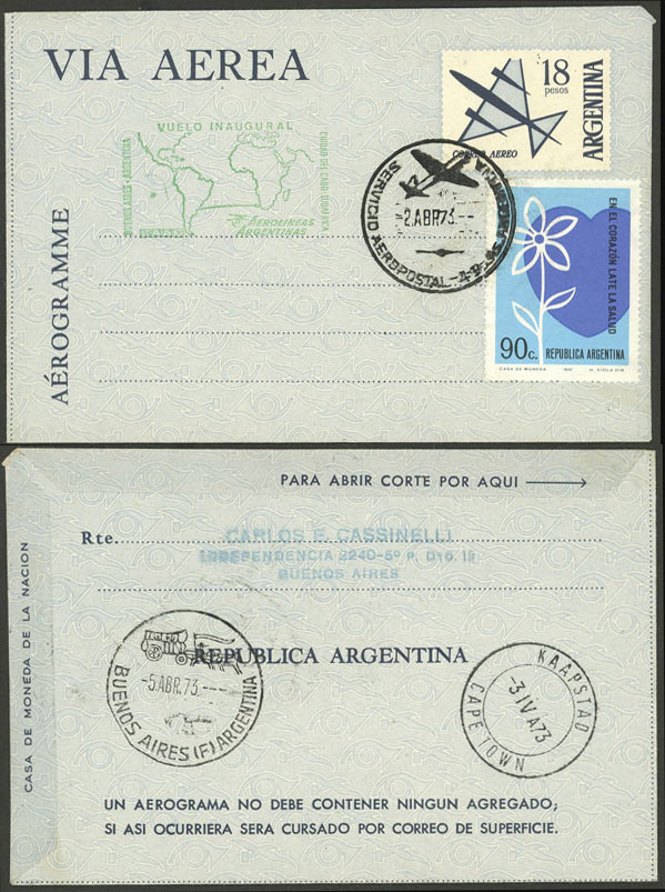 FLIGHT: $18 Aerogram uprated with 90c., sent from Buenos Aires to Cape Town (South Africa) on 2/AP/1973, with arrival backstamp, very nice! (Image)