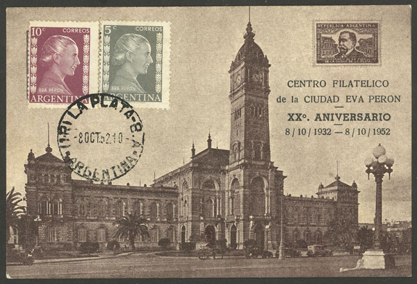 TOPIC PERONISM: Postcard of anniversary of the philatelic club of Ciudad Eva Perón, very nice (Image) (Image-02)