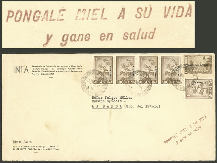 cover sent from Buenos Aires to Santiago del Estero on 2/JA/1957, with handstamp promoting honey and health ("Póngale miel a su vida y gane en salud") (Image)