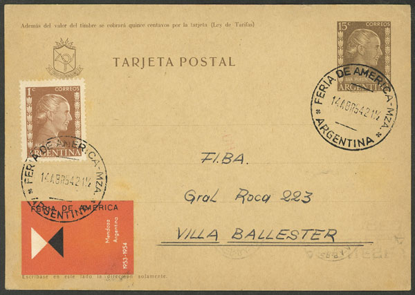 Postal card uprated with 1c., with postmark of "FERIA DE AMÉRICA - Mendoza", sent to Villa Ballester on 14/AP/1954, with cinderella of the Fair, VF (Image)