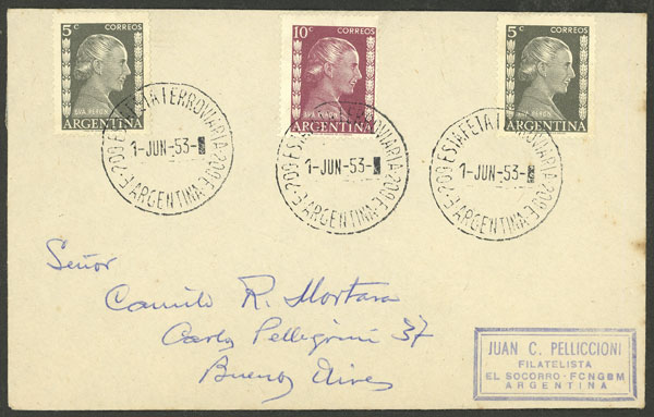 1/JUN/1953 "ESTAFETA FERROVIARIA 002" - "EL SOCORRO (Buenos Aires)", cover franked with 20c. (GJ.1004 x2 + 1005), with rare postmark and arrival mark, VF