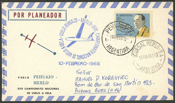 12/FE/1968, PEHUAJÓ - MERLO, cover flown by glider in the "XVII National glading championship", VF quality (Image)