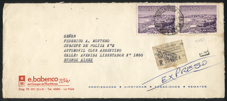 cover front with important postage of $600, franked with 2 stamps of $300 Mar del Plata, VF! (Image)