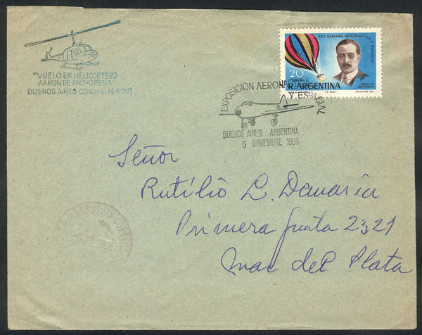 cover with postmark of the "Aeronautics Space Exposition" held in Buenos Aires on 6/NO/1968, including handstamp "Helicopter flight - Aaron de Anchorena / Bs As - Conchillas" + datestamp of that city, VF (Image)