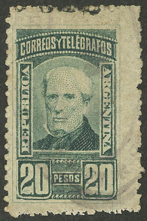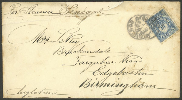 franking a cover sent from Buenos Aires to England by steamship "Senegal", arrival backstamp (Image)