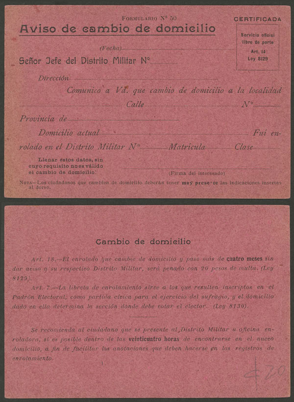 990   imageUnused changed of address notification (Form 50), to be used by men drafted in the military service (Image)