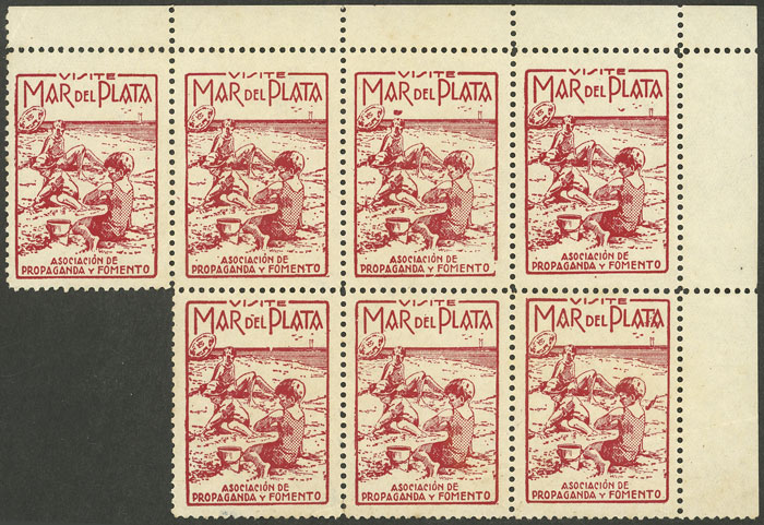 998   imageCorner block of 7 cinderellas advertising "Visit Mar del Plata" (Image)