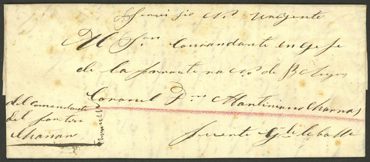 989   imageCover sent by relay mail, dated 12/MAY/1870, to Coronel Martiniano Charras, who had been sent to the frontier against the indians (Image)