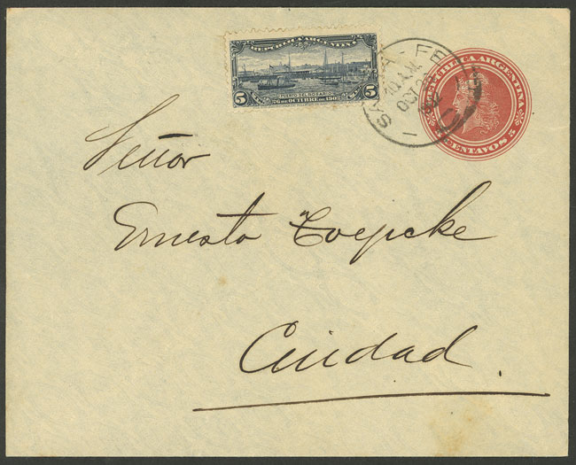 Port of Rosario (ships), uprating a 5c. stationery cover used in Santa Fe on 26/OC/1902 (first day of issue) (Image)