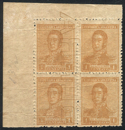 1c. San Martín, block of 4, all the stamps with SERRA BOND wmk, MNH (+50%), excellent quality! (Image)