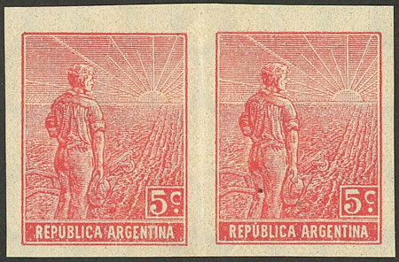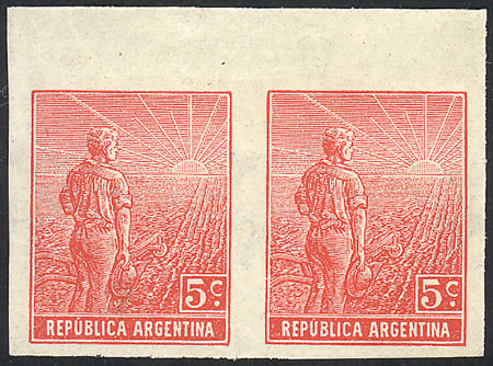 1911 5c. Plowman with sun wmk, IMPERFORATE PAIR (issued without gum), very fine quality, rare! (Image)