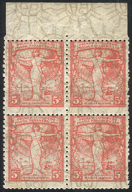 1922 Postal Congress, block of 4 with variety: DOUBLE WATERMARK printed on front, one inverted, MNH (with small hinge mark in the sheet margin), excellent and rare!