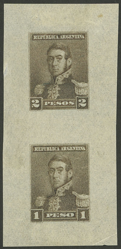 150, 1892 Multiple die proofs of values 2P. + 1P. San Martín, printed in dark chestnut on thin paper, VF quality! (Image)