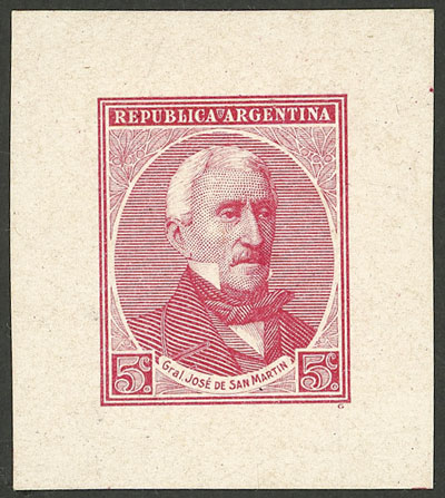 1923, project for a new issue commemorating San Martin and Rivadavia, 5c. old San Martín, die essay printed in rose on paper with glazed front, WITH the initials of the engraver at bottom right, rare, VF quality! (Image)