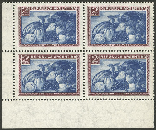 VARIETY: GJ.792a, 2P. Fruit with STRAIGHT RAYS watermark, corner block of 4 with recently found variety DOUBLE IMPRESSION OF THE CENTER (it will be included in the next edition of the GJ catalog as GJ.792a with a value of US$125, plus 30% MNH). Very