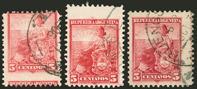 5c. Liberty, 3 used stamps with perforation varieties, one very shifted vertically, rare! (Image)