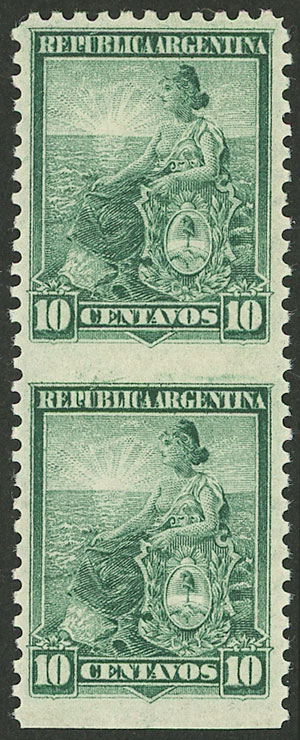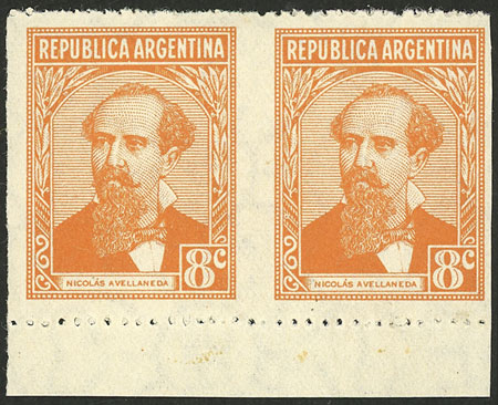 8c. Avellaneda, pair IMPERFORATE VERTICALLY (in the few known pairs with this variety, the perforation is barely impressed and it does not cut the paper), MNH (+30%), excellent quality, very rare! (Image)