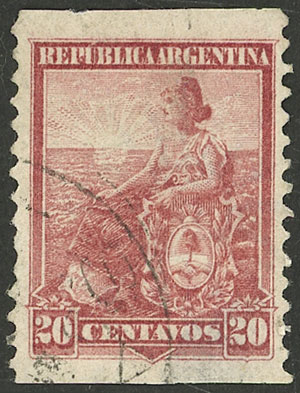 Liberty 20c. carmine with vertical perf 11½ and IMPERFORATE HORIZONTALLY, very wide margins, excellent quality, extremely rare! (Image)