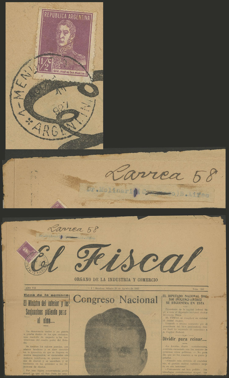 1924 ½c. San Martín w/o period franking ALONE a newspaper "El Fiscal" edited in Mendoza on 20/AU/1927 and sent to B.Aires, very fine quality, rare! (Image)