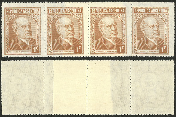 END-OF-ROLL DOUBLE PAPER: GJ.737H, 1c. Sarmiento, Dutch paper, strip of 4 printed on end-of-roll joined paper, VF, rare on this paper! (Image)