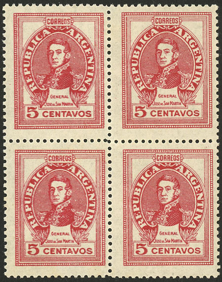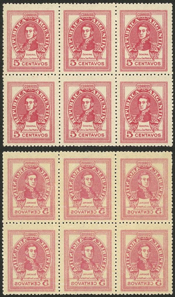 5c. San Martín without watermark, block of 6 with COMPLETE OFFSET IMPRESSION ON BACK, excellent! (Image)