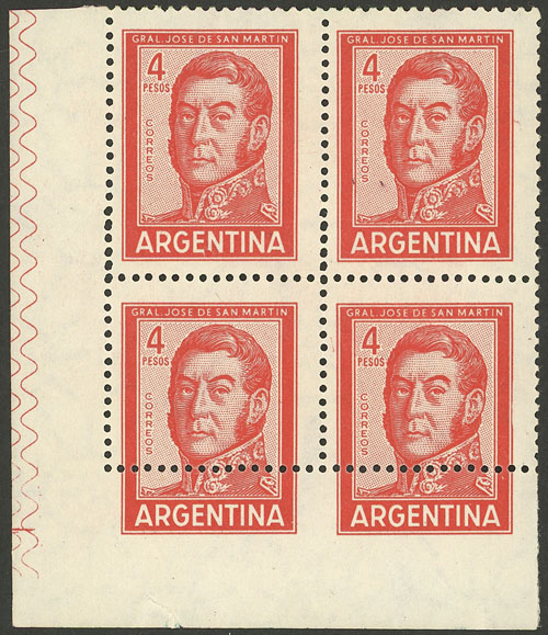 1959/64 4P. San Martín, corner block of 4 with the BOTTOM PERFORATION WITH STRONG UPWARD SHIFT (2 stamps very short, without "ARGENTINA"), MNH, excellent, rare!
