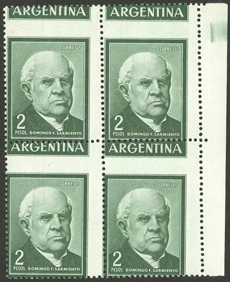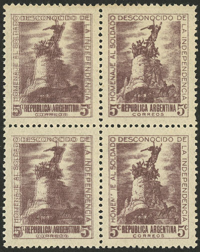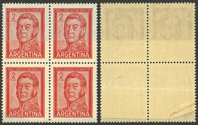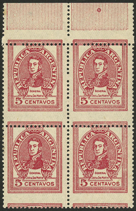 block of 4 with VERY SHIFTED PERFORATION ("ARGENTINA" at top in each stamp!), excellent! (Image)