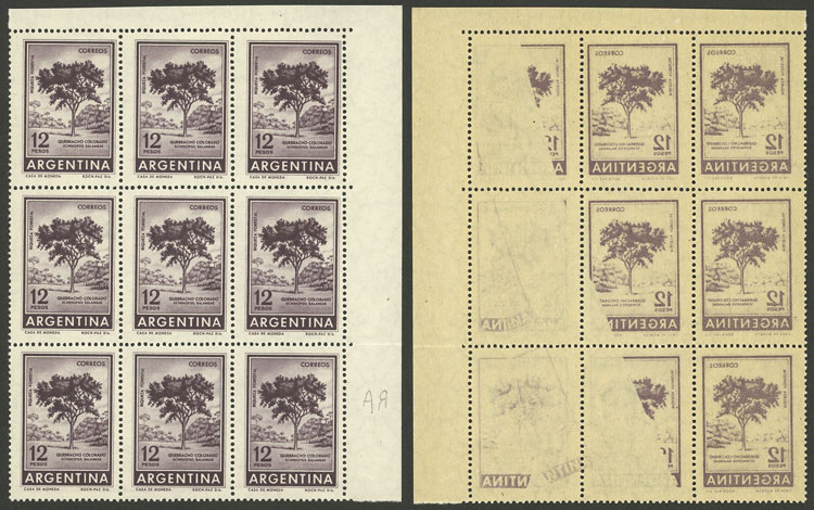 12P. Quebracho tree, block of 9 with strong OFFSET IMPRESSION ON BACK, excellent quality! (Image)