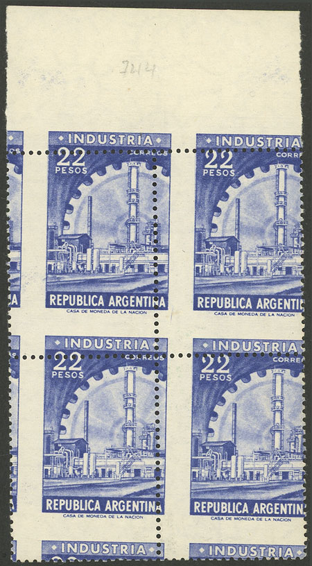 22P. Industry in photogravure (scarce very dark violet-blue color), block of 4 with very shifted perforation: "INDUSTRIA" at bottom, fantastic! (Image)
