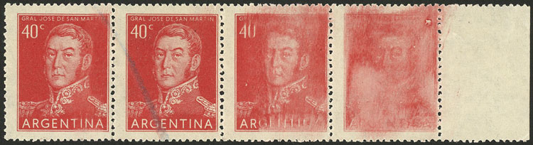40c. San Martín, strip of 4, the right stamps with notable BLURRED IMPRESSION variety, spectacular, very fine quality! (Image)