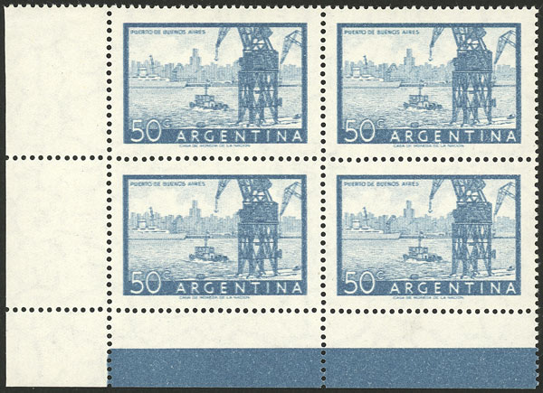 50c. Port of Buenos Aires (ships, crane), block of 4 with COMPLETE DOUBLE IMPRESSION variety, excellent! (Image)