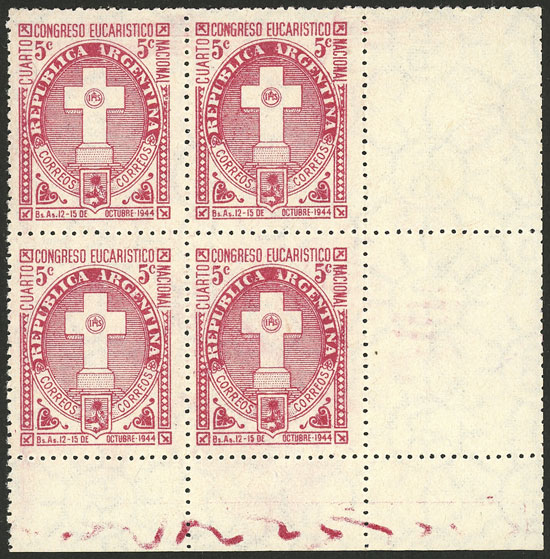 1944 5c. Eucharistic Congress, block of 4 WITH RIGHT LABELS, excellent quality! (Image)