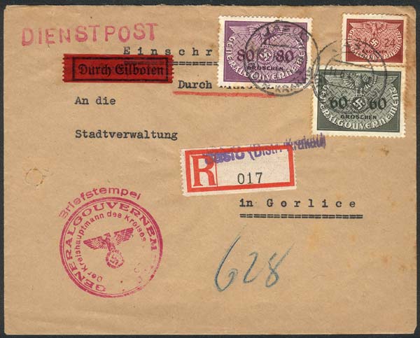 Registered cover (with repaired filing hole) sent from Jasio to Gorlice on 11/JUN/1942, very nice! (Image) (Image-02)