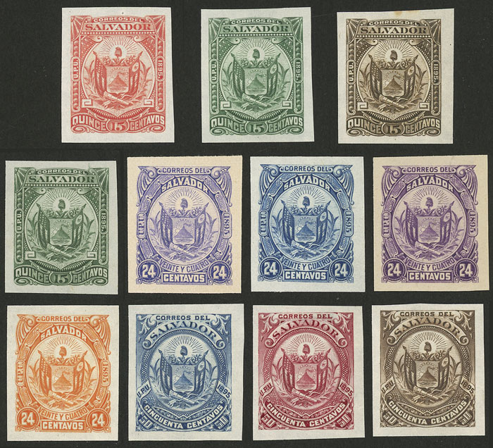 97 + 99 + 101, 1895 Coat of arms 15c., 24c. and 50c., color PROOFS, 11 different, very fine quality! (Image)
