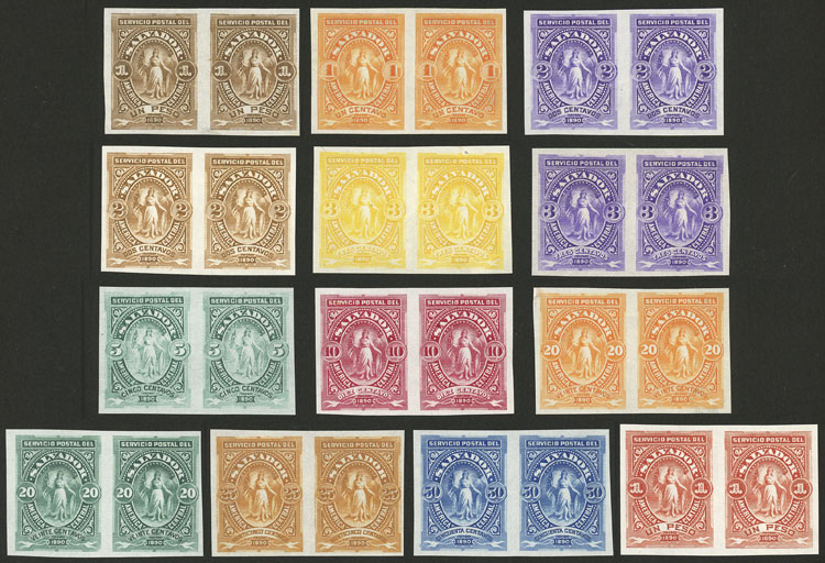 27/35, 1890 Victoria, PROOFS of the 9 values in imperforate pairs printed on very thin paper, of 4 we include two different colors, in total 13 pairs, very fine quality!