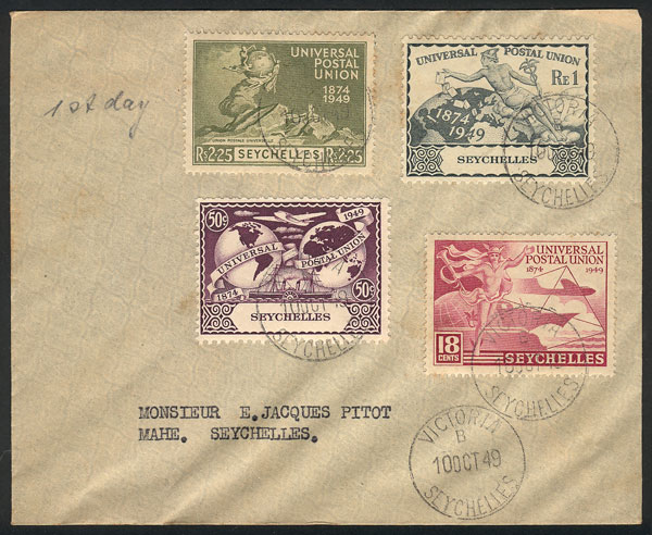 franked with the 4 values of the UPU anniversary issue, postmarked 10/OC/1949 (FDI), VF! (Image)