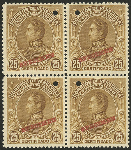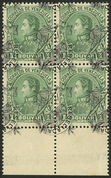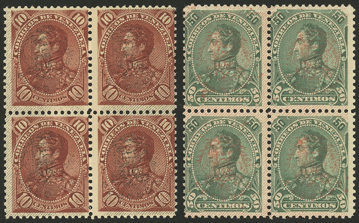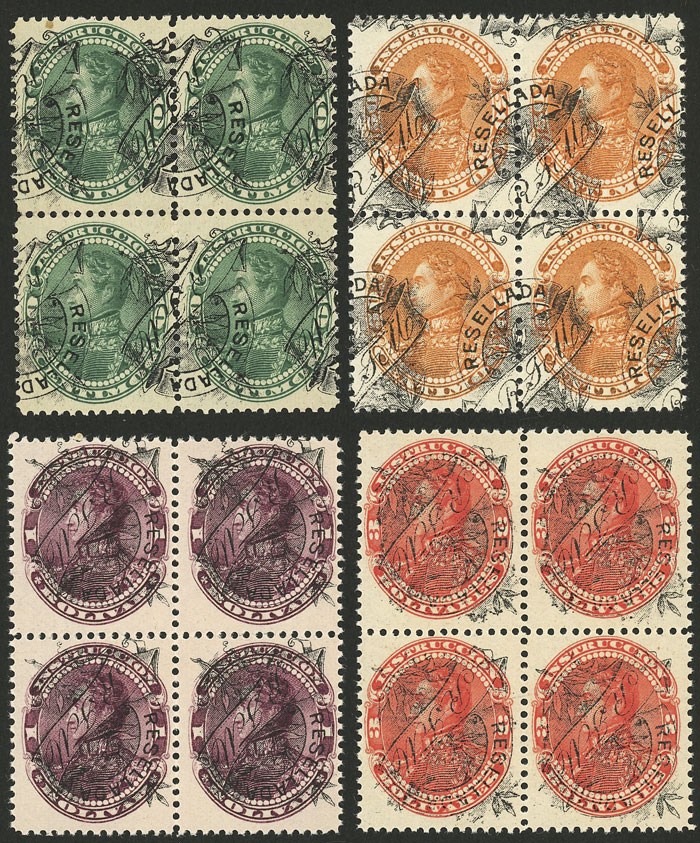 69A + 71A + 72A + 73A, 1900 Bolivar, 4 values of the set with INVERTED overprint, MNH blocks of 4 of excellent quality! (Image)