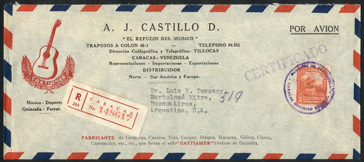 franked with 90c., sent from Caracas to Argentina on 26/NO/1946, with advertising cachet topic Music: GUITAR, very fine quality! (Image)