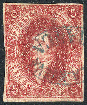 5th printing, PURPLE-CARMINE (scarce) with the rare small circle "VILLA NUEVA" cancel in green-blue, very nice and rare! (Image)