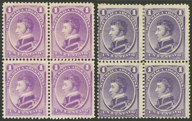 35A, 1867 1c. Balcarce, blocks of 4 in pruple and grayish violet, mint, handsome! (Image)