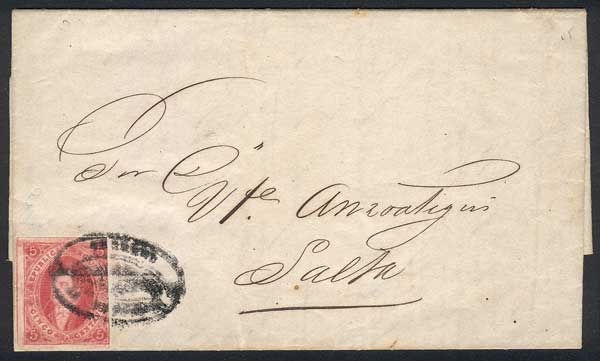 printing imperforate, franking a complete folded letter sent to Salta on 2/JA/1868, "rococo" cancel of TUCUMÁN, excellent quality! (Image)