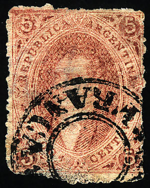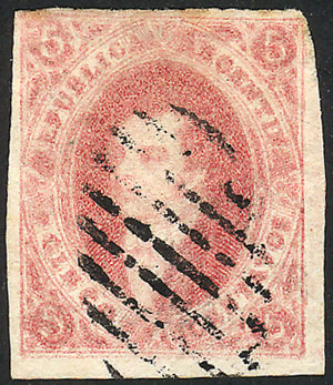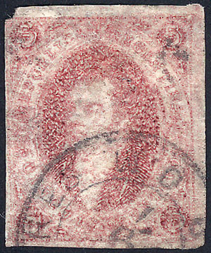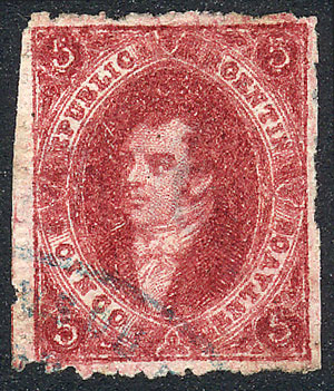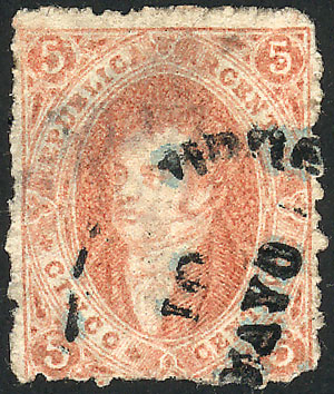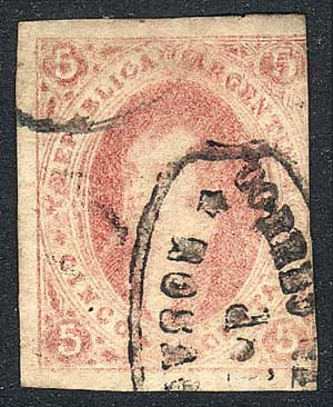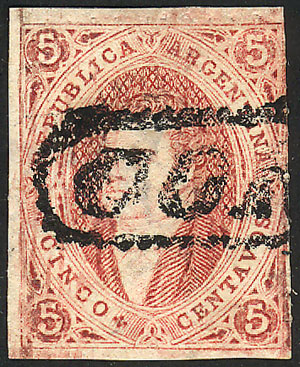 6th printing perforated, orangish dun-red, with datestamp of CONCEPCION DEL URUGUAY in rare indigo color, thinned on back, very nice front! (Image)