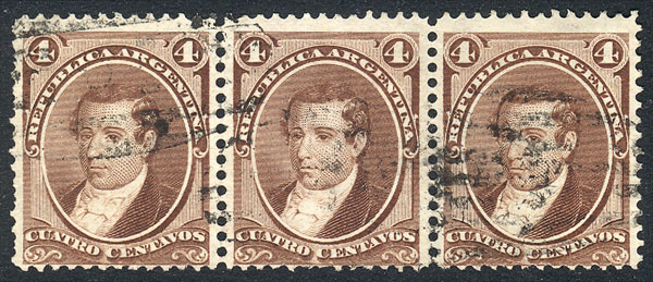 4c. strip of 3 with semi-mute "G" cancel of GUALEGUAYCHÚ, VF quality, rare! (Image)