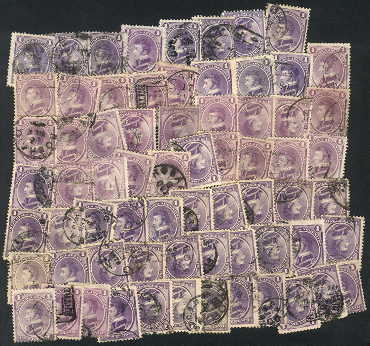 35A, 1867/73 1c. Balcarce in both colors, more than 65 used stamps, most of excellent quality, catalog value US$130+, good opportunity! (Image)