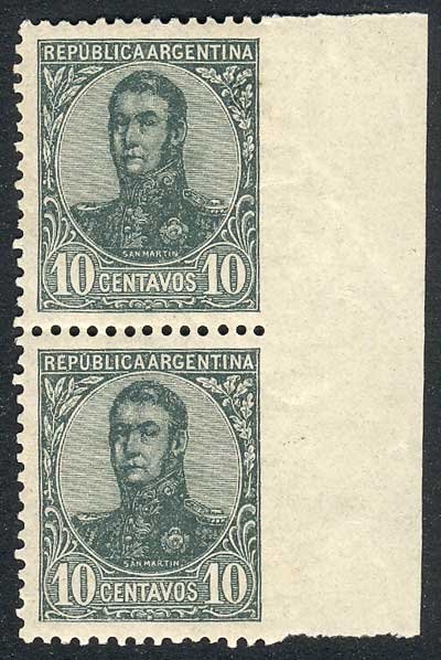 1908 10c. San Martín in oval, pair with variety: IMPERFORATE at right, excellent quality, extremely rare! (Image)