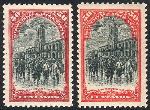 1910 50c. DARK CARMINE instead of red, mint with tiny hinge mark, superb and rare. Along a GJ.311 example for comparison. (Image)
