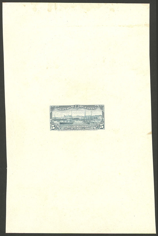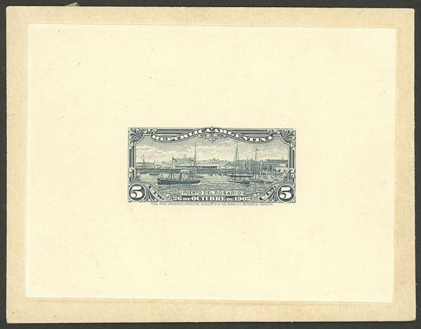 1902 Port of Rosario (ships, sailing boats, dock), DIE PROOF in grayish blue, printed on unsurfaced paper glued to card, excellent quality! (Image)
