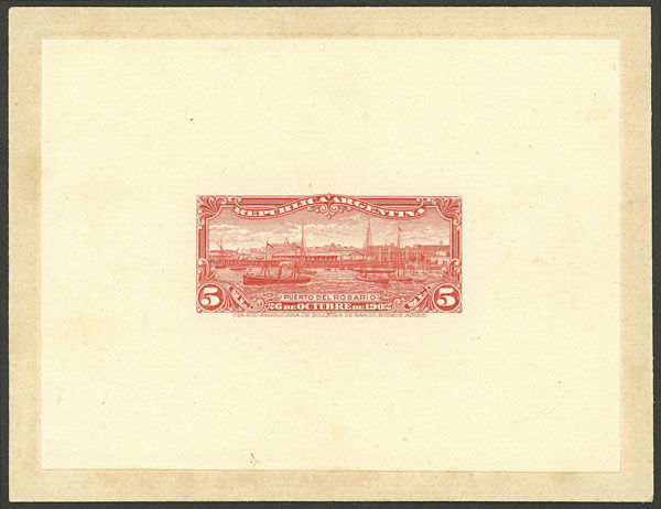 1902 Port of Rosario (ships, sailing boats, dock), DIE PROOF in bright red, printed on unsurfaced paper glued to card, excellent quality! (Image)
